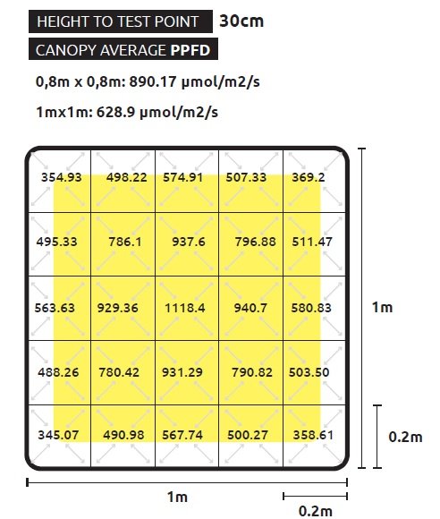 Lumatek Attis 300w modeli, 2,3 µmol/J 'de saniyede 690 µmol/s PPF üreten ve 100x100 cm yetiştirme alanları için ideal, oldukça verimli bir LED aydınlatmadır.